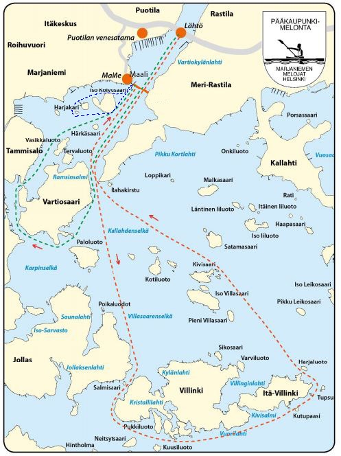 Lähtö tapahtuu Vuosaaren sillan alta yhteislähtönä (ei Koivusaarten kierros) ja maali on Vartiokylänlahdella kuvan osoittamassa paikassa.