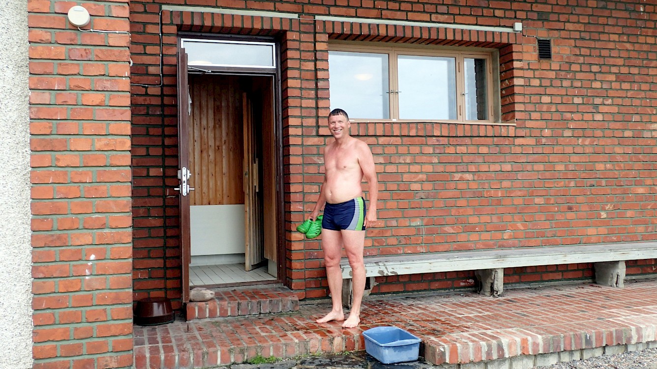 Perillä olimme reilusti ennen opaskierroksen alkua. Harri oli ottanut etukäteen selvää, että saunaan olisi vapaa pääsy. Osa porukasta jäi syömään ensimmäisiä eväitään, toiset katselemaan ympärilleen ja muutamat meistä suuntasivat saunalle. Epäuskoisina otimme saunan ovenkahvasta kiinni, ja onneksemme se aukeni! Joku kävi vielä tarkistamassa, että sauna olisi myös lämmin. Sitten vaan vauhdilla löylyjä heittämään ja mereen. Kyllä oli mahtavaa. Tänne täytyy ehdottomasti palata uudelleen!